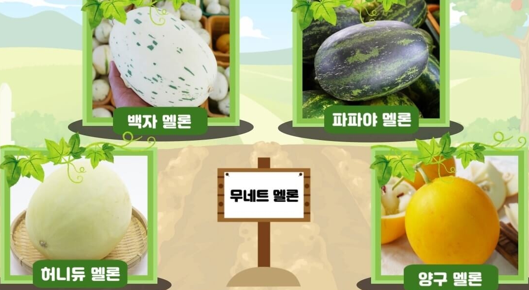 파파야 멜론 : 타원형 초록색 바탕에 검정 얼룩이 있으며, 당도가 높고 육질이 부드러워요.