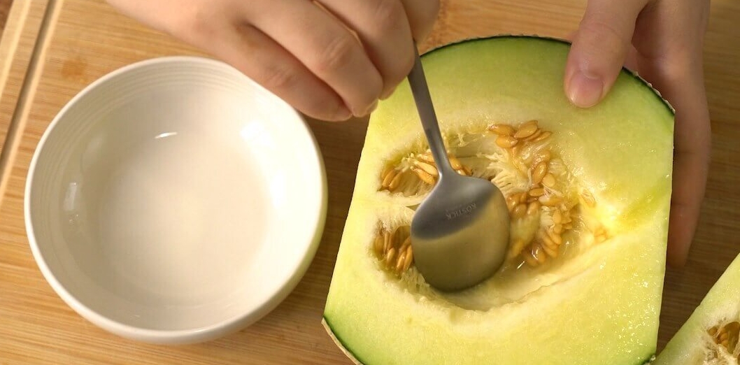 멜론 자르는 법으로는 꼭지와 배꼽 부분을 제거하고 반으로 가른 후, 안쪽에 있는 씨를 숟가락으로 긁어내어 버려주세요.