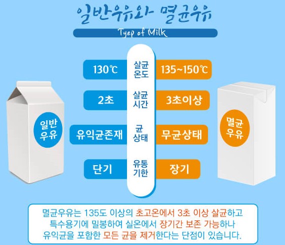 위의 사진은 일반우유와 멸균우유의 차이점으로 간편한 요약본으로 보시면 됩니다.