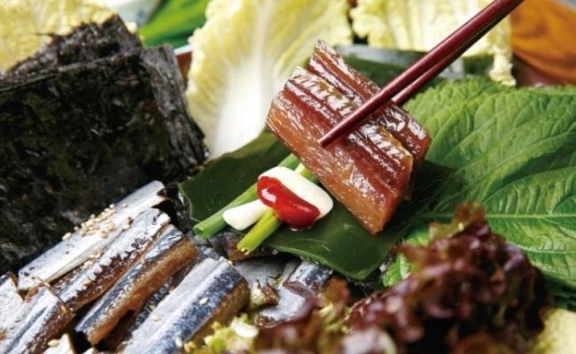 과메기를 더욱 맛있고 건강하게 먹는 방법은 궁합이 좋은 마늘과 김을 곁들여 먹는 것입니다. 과메기에는 비타민 B1을 파괴하는 물질이 들어 있어 마늘을 먹으면 이를 보충해 줄 수 있습니다. 김이나 다시마, 미역 등의 해조류 또한 비타민을 채워주며, 과메기의 비릿한 맛도 줄여줍니다. 특히 김의 향은 과메기와 잘 어울립니다. 과메기를 물미역과 함께 초장에 찍어 먹거나 마늘을 올려 김이나 쌈 채소와 함께 먹으면 좋습니다.